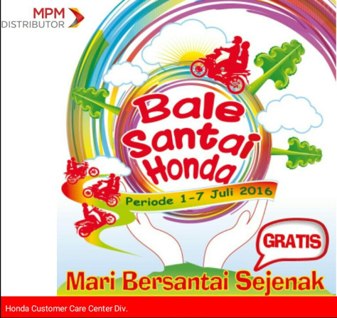 Bale Santai Honda ini merupakan rangkaian dalam kegiatan lebaran terhadap semua pemudik, baik pemudik yang menggunakan motor Honda, juga masyarakat umum termasuk didalamnya pengguna mobil dan transportasi umum, hal ini sebagai wujud kepedulian kepada masyarakat terutama konsumen yang melakukan mudik dengan sepeda motor mereka.