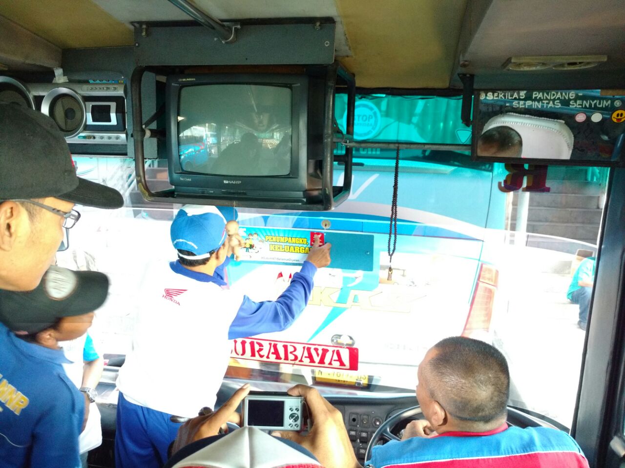 Di sana, arahan diberikan kepada para sopir bis dan kernet, sekitar hampir 200 bis yang sudah mendapatkan pengarahan mengenai keselamatan berkendara kemudian ditempeli stiker edukasi untuk pengingat baik kepada awak bus dan pengguna jalan lain.