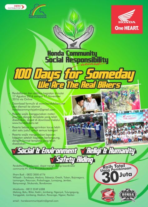 Nah itulah alur bagaimana untuk dapat mengikuti Honda Community Sosial Responsibility (HCSR) tersebut, dan jangan lupa ya brosis ada uang pembinaan untuk klub sebesar 30 Juta dan klub yang terpilih dan terbaik akan mendapat apresiasi untuk naik diatas panggung Honda Biker Day 2016 yang disaksikan puluhan ribu biker dari seluruh penjuru kota di Indonesia serta didampingi oleh Petinggi PT. Astra Honda Motor (AHM) Koji Sugita.