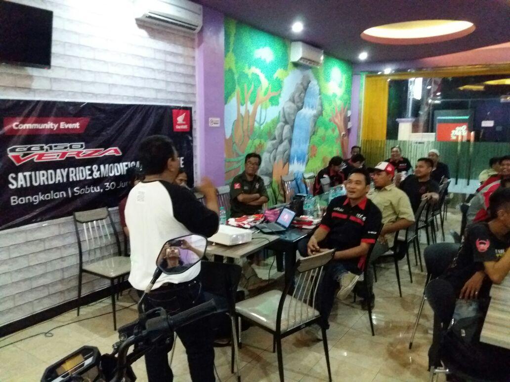 Sebelum kita memodifikasi motor kesayangan kita harus menentukan tujuan dari kita memodifikasi motor kesayangan kita, ada 2 kategori modifikasi motor yang bisa diaplikasikan pada motor kita yakni Street Legal ato Special Purpose, tutur Bung Indra. Sharing – sharing pun berjalan seru dengan sharing – sharing anggota komunitas perihal memodifikasi motornya masing – masing dengan jawaban dan saran yang menarik dari Bung Indra. Community Development MPM Dsitributor Fariz Hadi menuturkan bahwa kegiatan Honda Cb150 verza saturdayride dan modification garage dikemas dengan gathering , sekaligus halal bihalal sesama anggota komunitas, MPM Distributor sebagai main dealer berusaha memfasilitasi kegiatan positif komunitas Honda di Jawa Timur dan NTT.