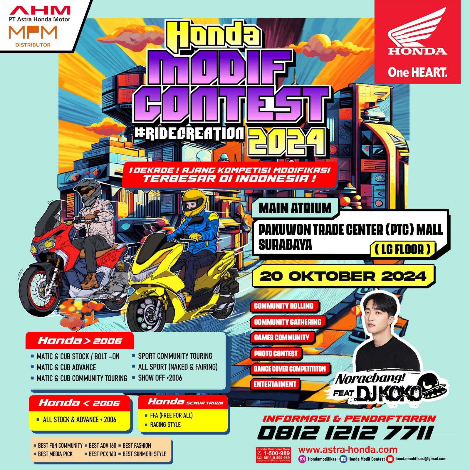 Ajang adu kreativitas modifikator motor kembali di gelar di kota pahlawan Surabaya oleh PT. AHM dan MPM Honda Jatim dalam Honda Modif Contest (HMC) 2024 #RIDECREAT10N.