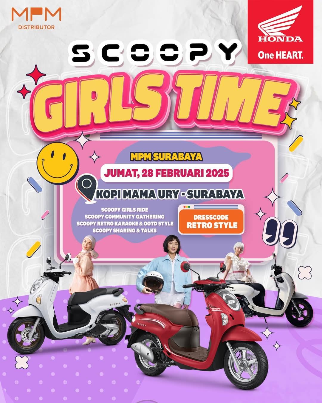 Halo mas bro dan mbak sis, bagi sampeyan yang tergabung di komunitas Honda Scoopy atau pemilik maupun pencinta Honda Scoopy khususnya wilayah Surabaya dan Malang, yuk ikutan acara Scoopy Girls Time.