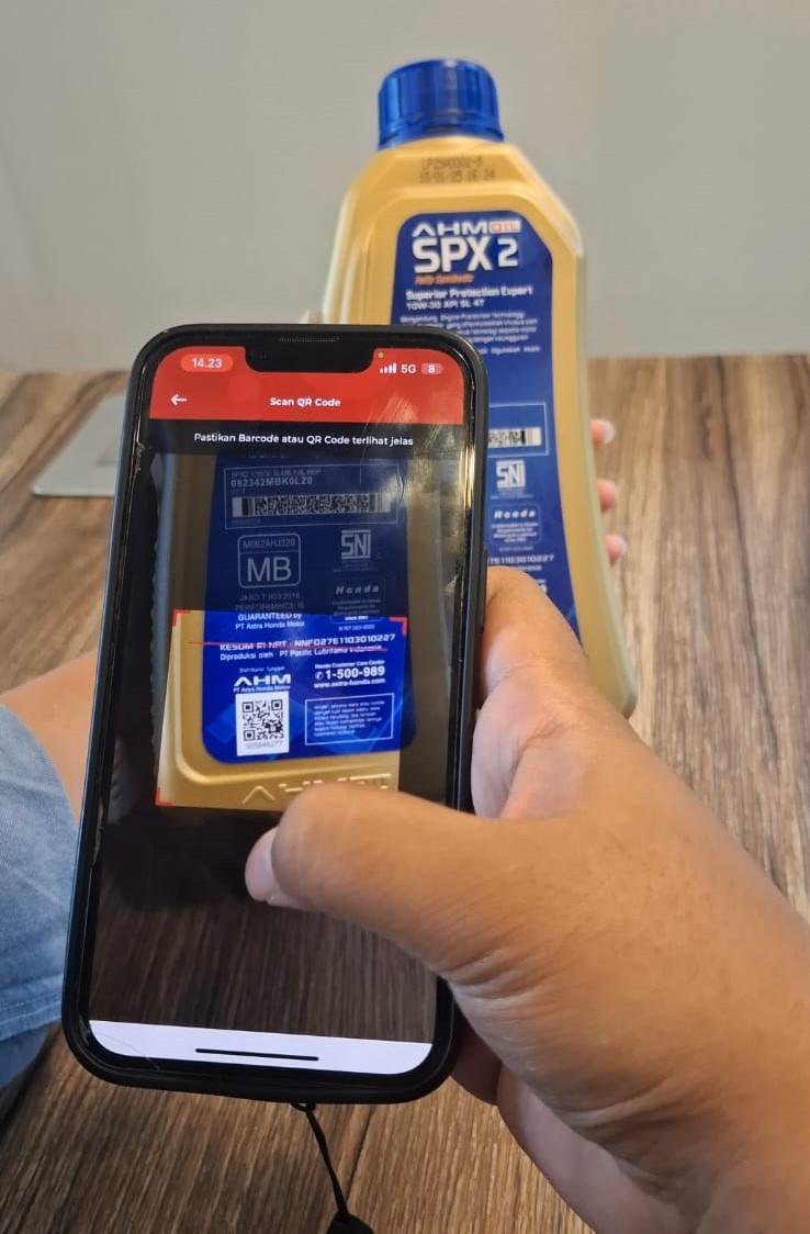 1. Pindai QR Code Konsumen dapat memindai QR Code di bagian belakang kemasan AHM Oil melalui aplikasi scan barcode yang tersedia di Play Store, seperti Brompit. QR Code akan memberikan informasi terkait validitas produk serta indikasi jika oli diragukan keasliannya. QR Code hanya dapat dipindai maksimal 5 kali dengan perangkat berbeda. Konsumen juga dapat melaporkan jika terdapat masalah pada kemasan.
