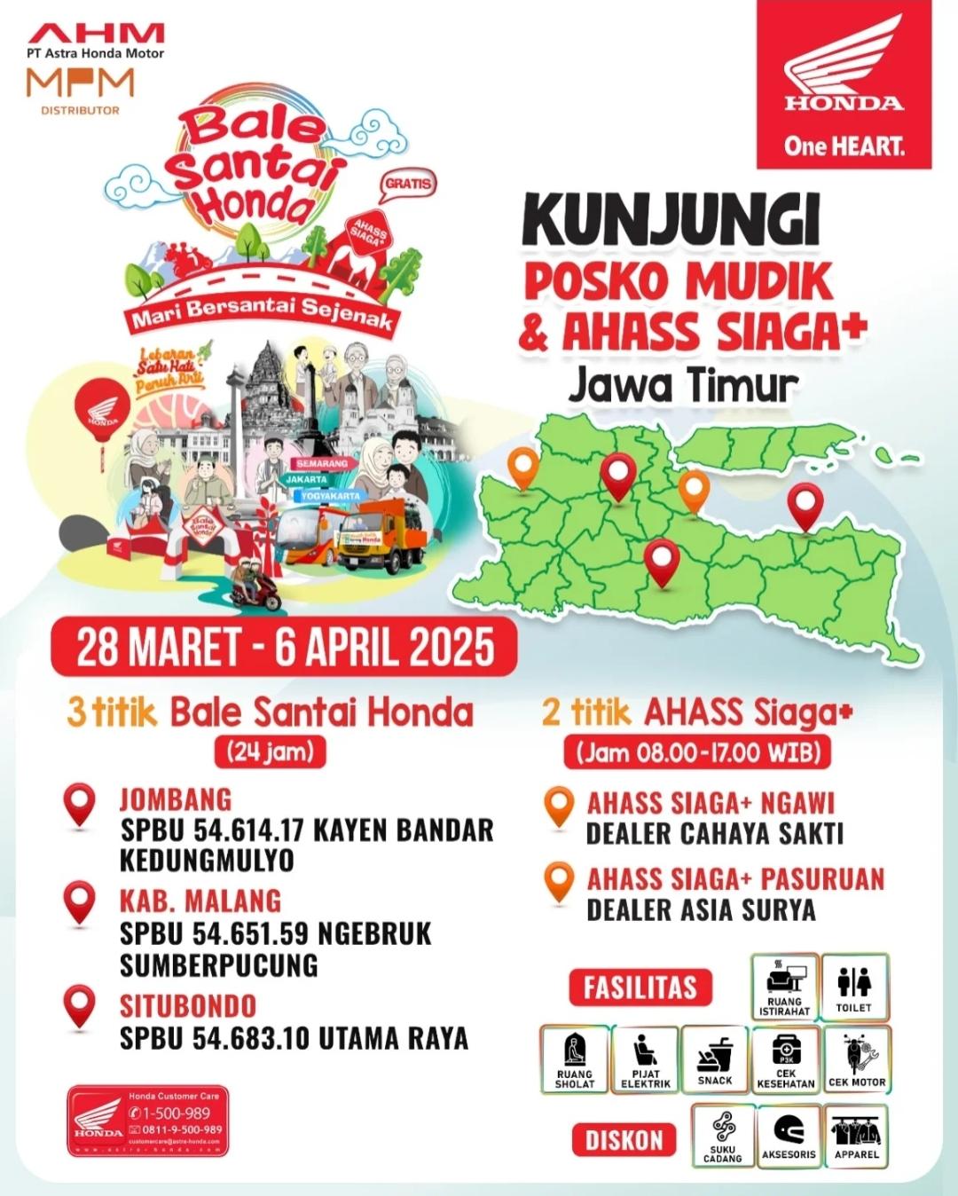 Selain Bale Santai Honda, MPM Honda Jatim juga menghadirkan AHASS Siaga dan AHASS Siaga Plus yang tetap buka selama libur Lebaran untuk memastikan kendaraan tetap dalam kondisi optimal.