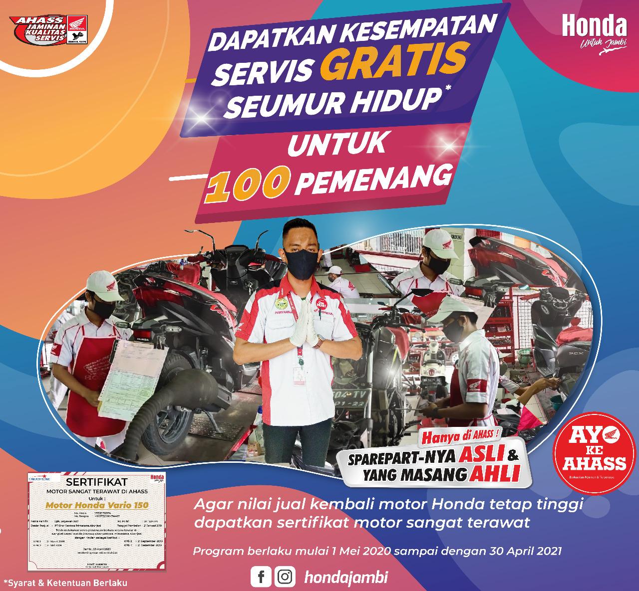 JAMBI - Guna mengapresiasi konsumen setia Honda, PT Sinar Sentosa Primatama (Sinsen) Main Dealer sepeda motor Honda di Provinsi Jambi memberikan program bertajuk “Gratis Servis Seumur Hidup” untuk 100 orang pemenang yang beruntung.